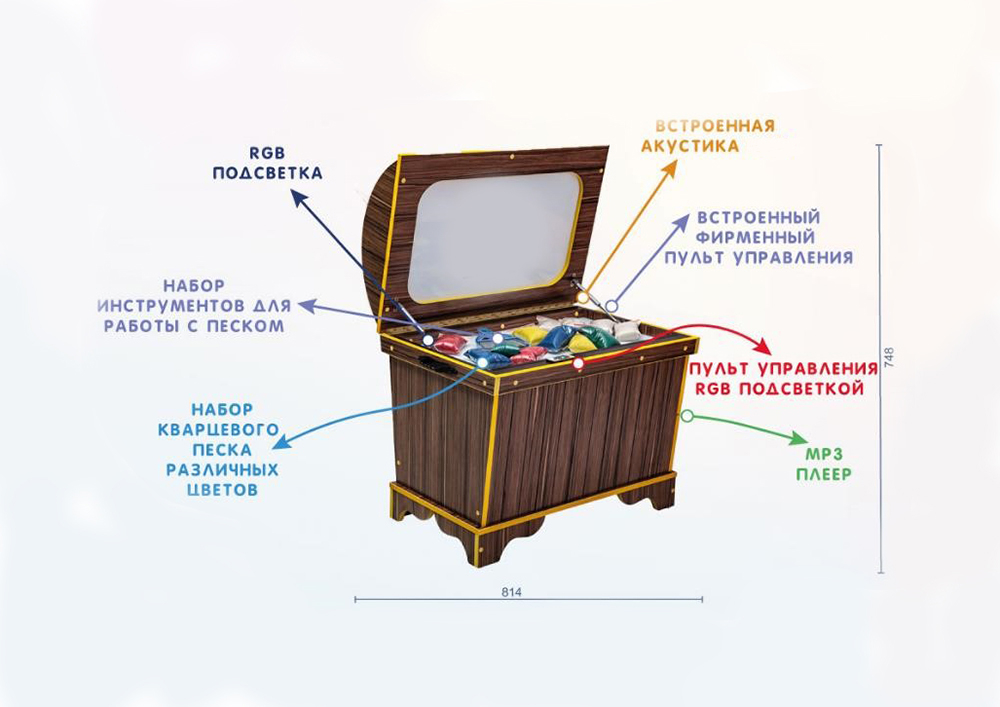 Песочный стол с подсветкой для рисования песком, выполненный в виде сундука, отлично подойдет для творчества и развития мелкой моторики детей. Планшет песочной анимации, установленный в ДОУ, в кабинете психолога, логопеда, в коррекционной школе или интернате, поможет ребенку погрузиться в волшебный мир песочной анимации.
