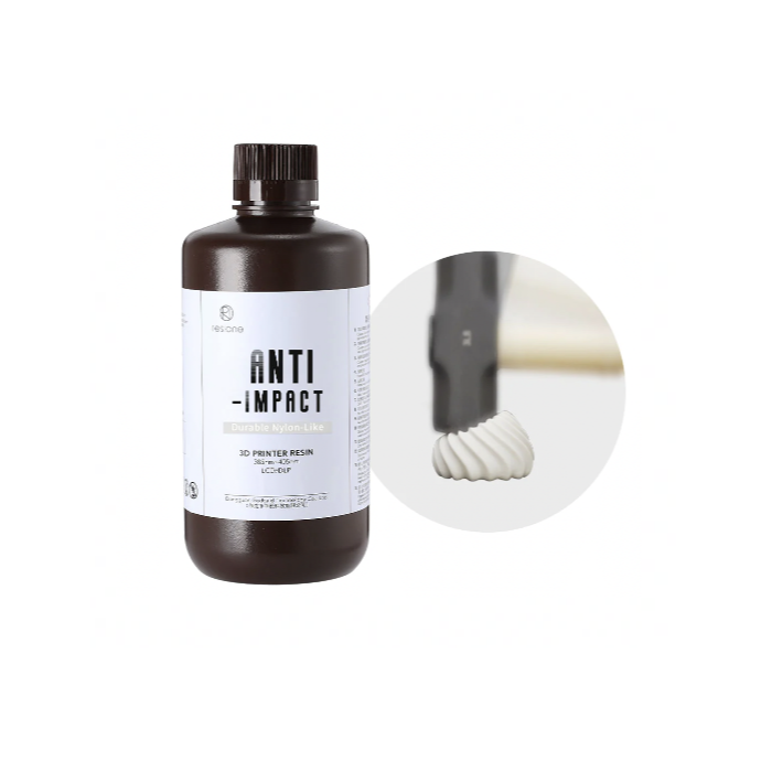 Фотополимер RESIONE Anti-Impact - высокая ударная вязкость и прочность на растяжение. Противоударная смола представляет собой прочный нейлоноподобный материал, обладающий впечатляющей ударной вязкостью и прочностью на растяжение. Его печатные объекты отличаются исключительной долговечностью, низким водопоглощением, высокой точностью размеров и износостойкой поверхностью, обеспечивающей долгий срок службы. Благодаря своим стабильным механическим свойствам, отличной усталостной прочности и атмосферостойкости эта смола идеально подходит для создания деталей, требующих повторяемой механической обработки, работы во влажных или подводных условиях, ударопрочности, защелкивающихся элементов или даже продуктов конечного использования.