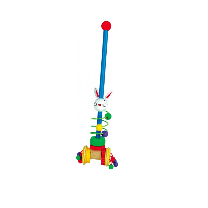Яркая разноцветная игрушка-каталка изготовлена из экологически чистой древесины. Каталка на длинной ручке, заканчивающейся шариком, чтобы ручке малыша было удобно ее возить. Игрушка предназначена для малыша, начинающего ходить. На ручке каталки находится цветная металлическая спираль с бусинками и забавная фигурка зайчика. На колесиках каталки имеются по 4 бусинки. Когда ребенок катает игрушку, она начинает тарахтеть благодаря бусинкам на колесиках, а зайчик вращается вокруг своей оси. Ребенка заинтересуют эти действия, и у него появляется желание двигаться и активно действовать.