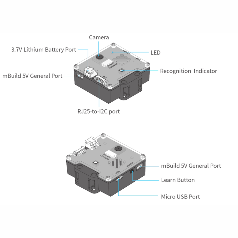 - Камера совместима с базовыми роботами mBot, mBot Ranger, Ultimate и контроллерами HaloCode, Nova Pi. Программирование осуществляется в среде Arduino, графическим языком.